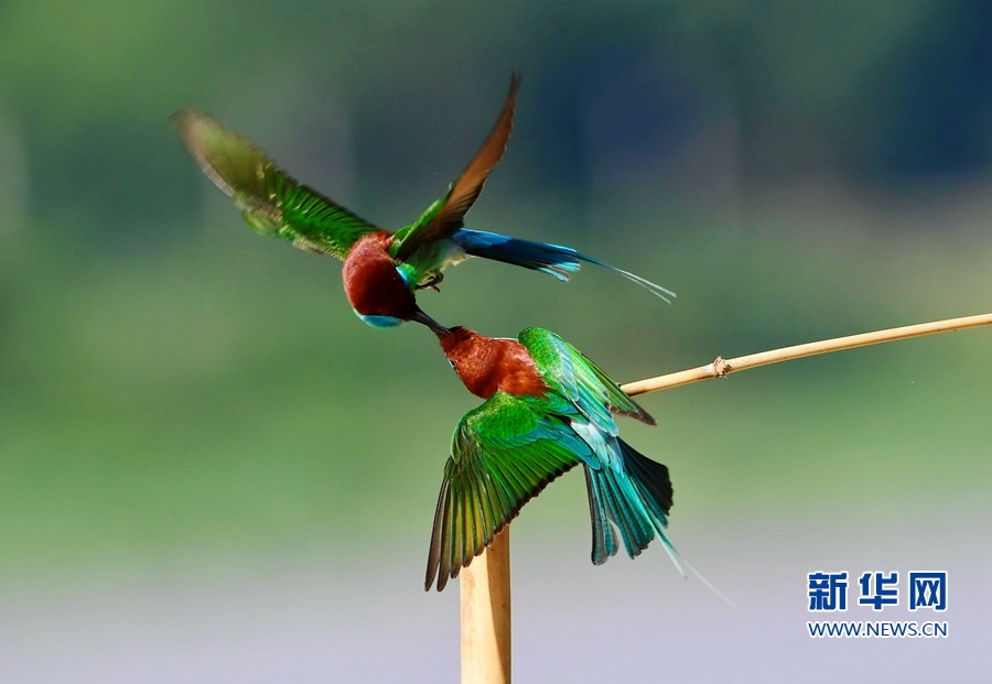 6月11日,两只蓝喉蜂虎在“打架”。动物们经常会为了食物、地盘或者异性展开“争夺战”。新华社记者 梅永存 摄