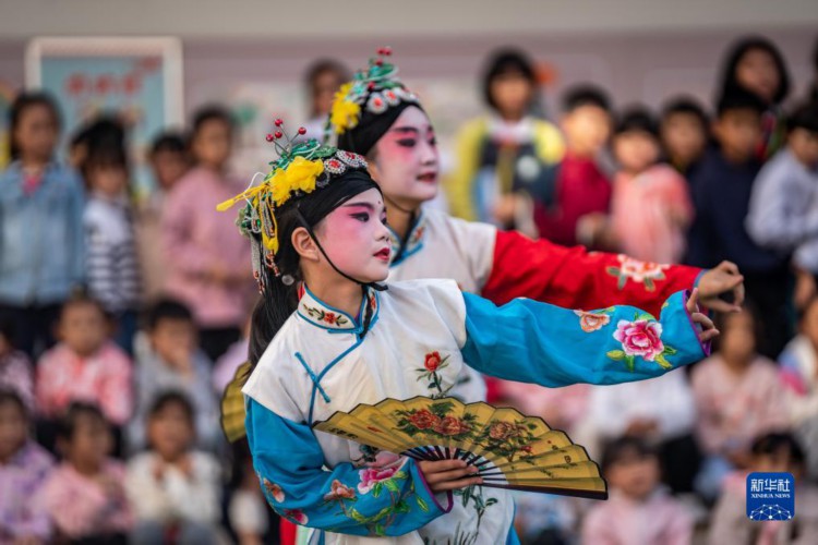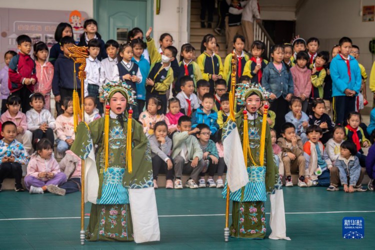 10月26日,在文林小学,少儿滇剧传习班的小演员在表演节目。 当日,云南省昆明市五华区文林小学开展滇剧演出活动,少儿滇剧传习班的小演员们表演了多个节目。文林小学自2014年开始与昆明市文化馆联合开展滇剧进校园活动,成为云南省滇剧文化传承项目的第一所试点小学。目前,学校已累计培养小演员近500名,孩子们加深了对非遗文化的认识,提升了审美情趣和艺术素养。 新华社记者 胡超 摄