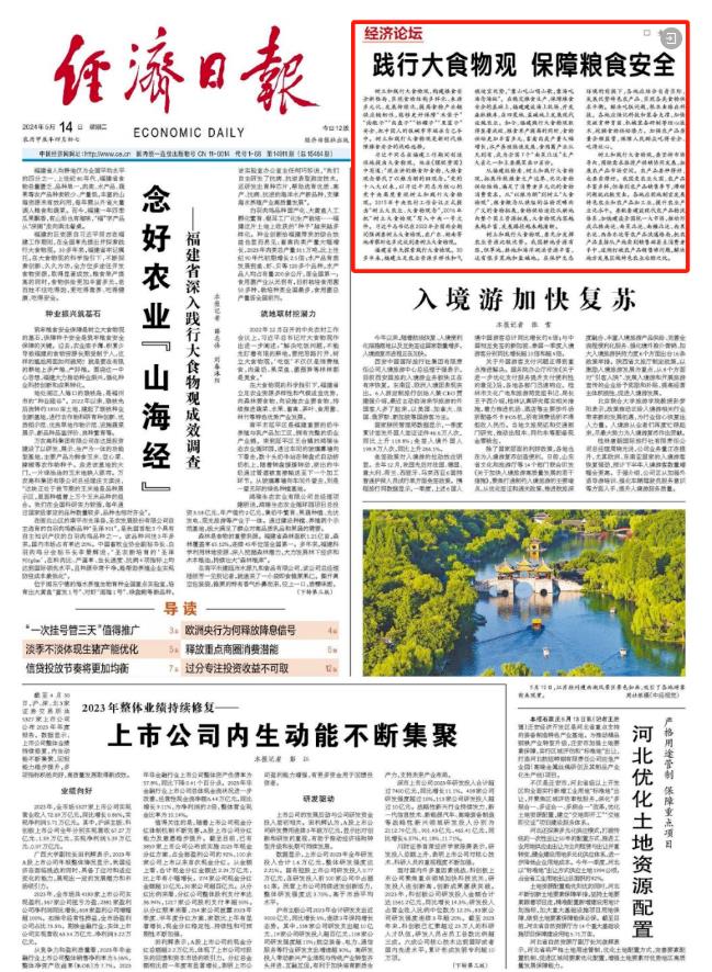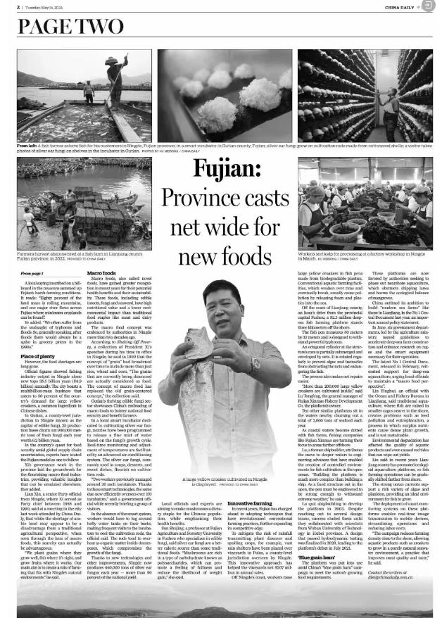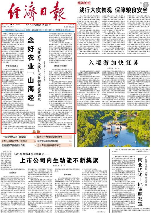 5月14日 中央主要媒体 继续在显著位置 关注福建践行大食物观的 实践和经验 ↓↓↓ 人民日报 5月14日,《人民日报》要闻版刊发文章《福建加快建设“蓝色粮仓” 推进海洋渔业高质量发展》,聚焦福建“向海洋要食物”的积极探索。 中央广播电视总台 5月14日,总台央视《新闻联播》播出《践行大食物观的福建启示 构建多元化食物供给体系 端牢中国饭碗》,关注福建食物供给丰富多元,展现大食物观的实践力量。 5月14日,总台央视《新闻直播间》栏目播出《“食”在山海间 大黄鱼搬家 “海上牧场走向深蓝”》,关注福建连江提升养殖技术,探索打造深远海养殖新模式。 此外,栏目还播出《“食”在山海间 福建人的“花式养鱼”》,聚焦福建三明市泰宁县和福建宁德市三都澳的生态养殖,践行大食物观。 5月14日,中央人民广播电台《新闻和报纸摘要》播发报道《践行大食物观的福建启示丨因地制宜 走特色发展之路》。 经济日报 5月14日,《经济日报》头版刊发文章《念好农业“山海经”——福建省深入践行大食物观成效调查》,关注福建全方位多途径开发食物资源,取得的显著成效。 《经济日报》同时配发评论文章《践行大食物观 保障粮食安全》。 中国日报 5月14日,《中国日报》刊发《Fujian's innovations lead nation's quest for food security》 |