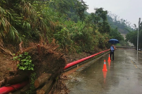 6月13日,110民警巡逻至后谷小区路段时,发现连日大雨造成道路一侧出现山体滑坡,巨大的树墩连同土块滚到路面上,周围散落不少树枝,且塌方位置正处在拐弯路段,民警第一时间在塌方路段两侧设置反光锥,并及时清理树枝等杂物,同时联系公路部门到场对树墩进行处理,确保塌方路段行车安全。 汛情排查,确保安全