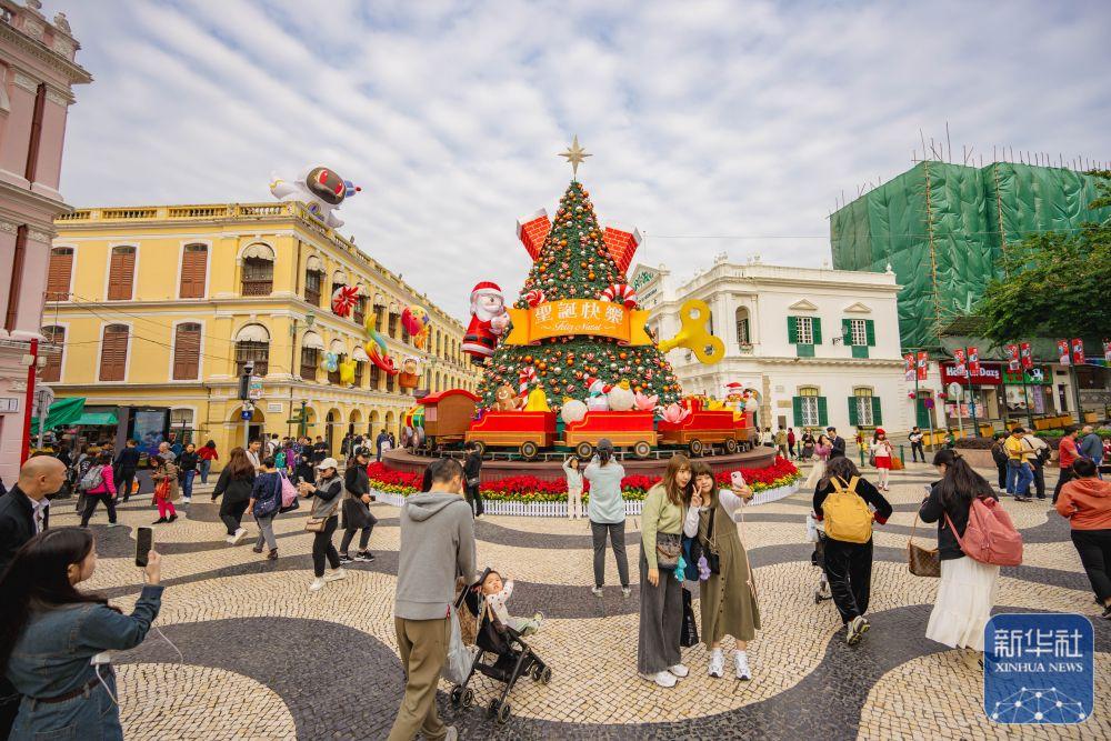 12月12日,游客在澳门议事亭前地的圣诞树前拍照。