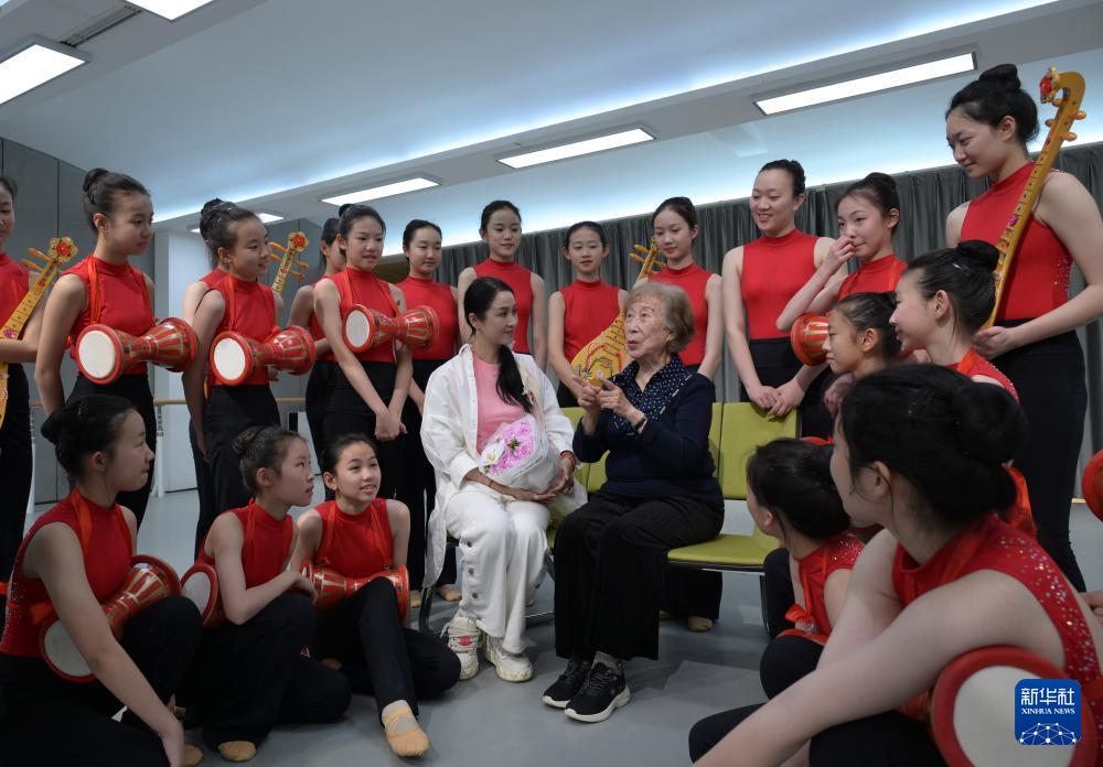 4月25日,高金荣(前排左五)与学生交流互动。 当日,敦煌舞教学体系创始人、2024年“最美教师”高金荣走进北京师范大学附属中学,为金帆舞蹈团的学生们进行敦煌舞指导。在授课过程中,高金荣老师不仅传授了专业的舞蹈技巧,还分享了敦煌舞背后的历史文化底蕴。 新华社记者 金良快 摄