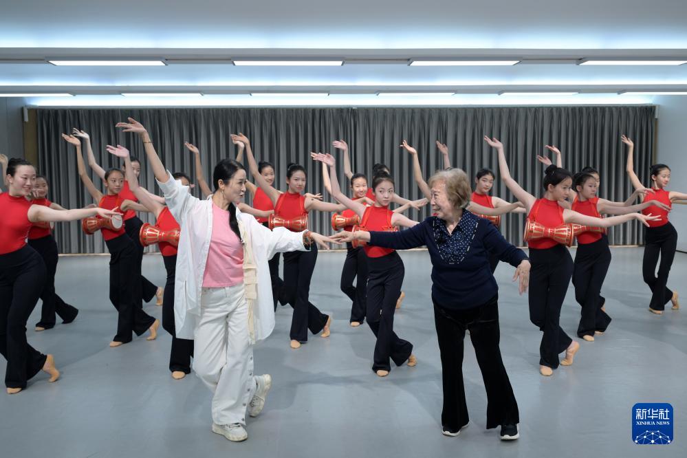4月25日,高金荣(右一)为学生指点敦煌舞动作要领。 当日,敦煌舞教学体系创始人、2024年“最美教师”高金荣走进北京师范大学附属中学,为金帆舞蹈团的学生们进行敦煌舞指导。在授课过程中,高金荣老师不仅传授了专业的舞蹈技巧,还分享了敦煌舞背后的历史文化底蕴。 新华社记者 金良快 摄