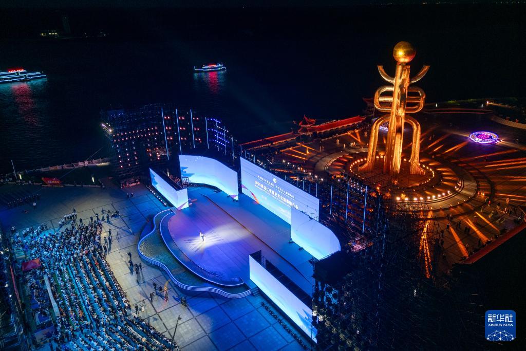 7月2日拍摄的2025黑龙江省特色文化旅游推介会现场(无人机照片)。 当日,2025黑龙江省特色文化旅游推介会在抚远市举行,来自黑龙江省13个市(地)的演职人员热情推介家乡的自然生态和人文风情,《黑龙江省支持冰雪经济发展若干政策措施》也在会上同时发布。 新华社记者 张涛 摄