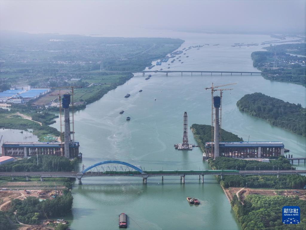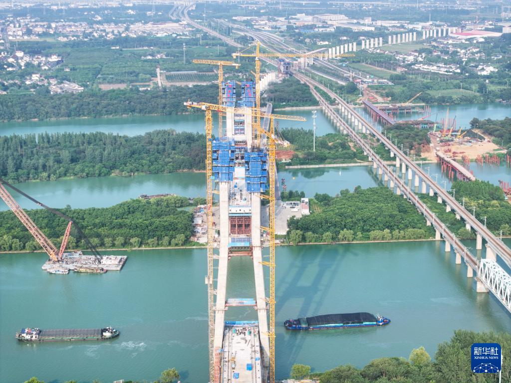 这是沪渝蓉高铁跨京杭运河斜拉桥施工现场(7月13日摄,无人机照片)。 近日,由中国铁建大桥局承建的沪渝蓉高铁跨京杭运河斜拉桥主桥两岸钢混段架设顺利完成,大桥主桥上部结构施工转入钢梁悬臂拼装阶段,主塔建设已完成90%。据悉,该桥位于江苏扬州境内,是沪渝蓉高铁全线关键控制性工程,桥长564.3米,主跨300米。 沪渝蓉高铁是国家“八纵八横”高铁骨干通道之一,线路总长约2100公里,设计时速350公里。 新华社记者 季春鹏 摄