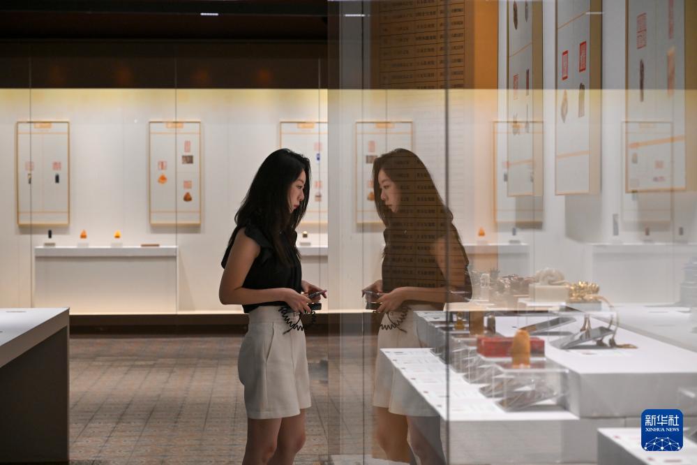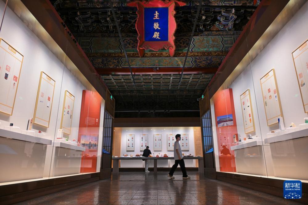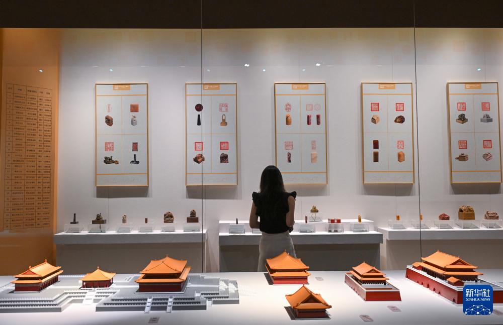 7月27日,观众在故宫文华殿欣赏篆刻作品展。 当日,由故宫博物院、北京京企中轴线保护公益基金会共同主办,北京歌华文化中心有限公司承办的“世界文化遗产北京中轴线——印记北京中轴线大众篆刻作品展故宫站”在北京故宫博物院文华殿开幕。 展览分为“大众篆刻·中轴新章:人民笔下的中轴线”“故宫玺印·紫禁回响:宫廷印章中的历史密码”两大板块,主要展出200枚大众篆刻作品与20方清代宫廷玺印。 新华社记者 金良快 摄