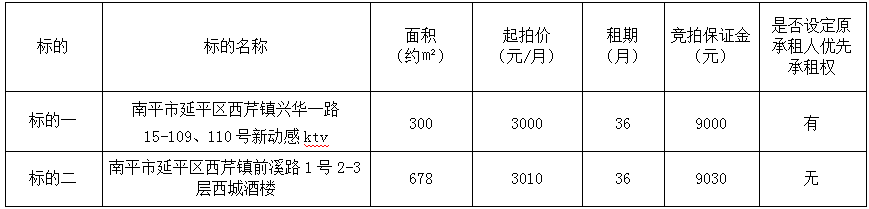 受委托,定于2025年9月3日上午9:00,通过延平区阳光平台(http://ypygpt.zgpm.com/)举行公开网络竞拍: 一、竞拍标的:南平市延平区西芹镇KTV、酒楼36个月租赁权,具体标的详情如下: 南平市延平区西芹镇KTV、酒楼36个月租赁权一览表 二、竞拍保证金及平台报名截止时间 竞拍保证金截止时间:具体竞拍保证金详见以上表格,即日起至2025年9月2日下午5时前; 平台报名截止时间:即日起至标的开拍前半小时。 报名时凭竞拍保证金缴存凭据确认竞租人资格。具体办理报名、看样、缴纳竞拍保证金等相关手续,请有意竞租人与我中心联系。 竞拍保证金汇入以下指定账户: 户名:南平市延平区公共资源交易中心; 账号:9558831406000015950; 开户行:中国工商银行股份有限公司南平延平支行。 三、本次竞拍标的物优先承租权:标的一有原承租人。 四、展示地点:标的物所在地;展示时间:2025年8月26日起。 五、联系地址及详情咨询电话: 中心地址:南平市延平区公共资源交易中心(南平市延平区八一路439号南平市延平区政务服务中心4楼)。 中心联系人:0599-8801022小张。 看房联系人:18650641528肖富佺。 六、有关竞拍的其他事项及规定详见《竞拍规则》。 微信公众号:延平区政务服务中心。 发布竞拍公告及规则的媒介:南平市公共资源交易中心延平区分中心(https://ggzy.np.gov.cn/yp/)、延平区阳光平台(http://ypygpt.zgpm.com/)、中国拍卖行业协会网站、延平区人民政府网(http://www.ypzf.gov.cn/)、延平新闻网。 南平市延平区公共资源交易中心 中拍平台网络科技股份有限公司 2025年8月26日 |