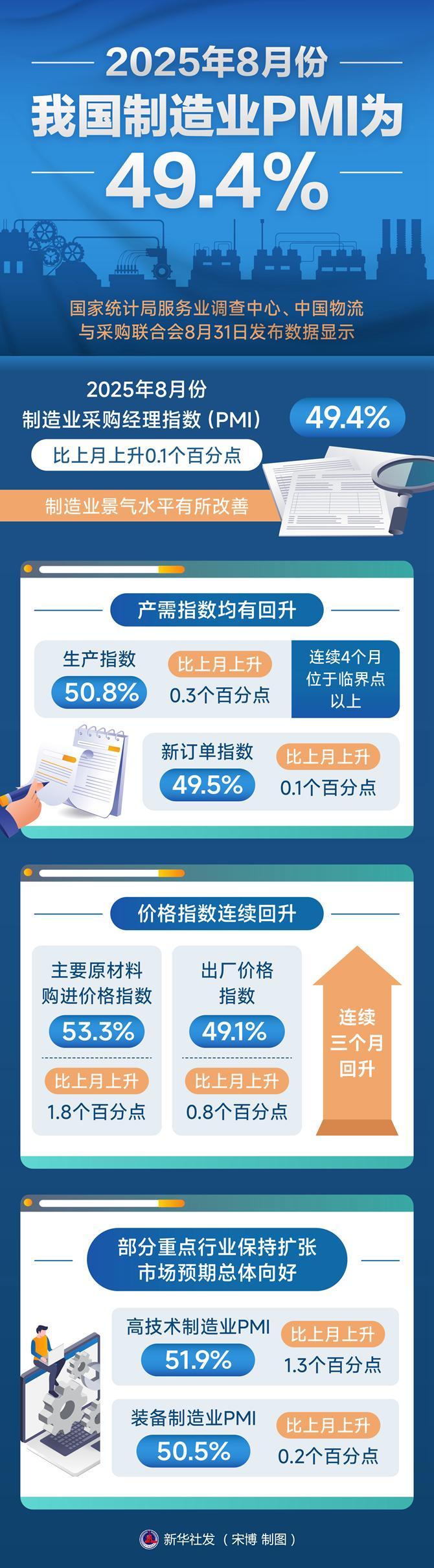 新华社北京8月31日电(记者王雨萧)国家统计局服务业调查中心、中国物流与采购联合会31日发布数据显示,8月份制造业采购经理指数(PMI)为49.4%,比上月上升0.1个百分点,制造业景气水平有所改善。 产需指数均有回升。生产指数为50.8%,比上月上升0.3个百分点,连续4个月位于临界点以上,制造业生产扩张加快;新订单指数为49.5%,比上月上升0.1个百分点。从行业看,医药、计算机通信电子设备等行业生产指数和新订单指数均明显高于制造业总体,产需较快释放;纺织服装服饰、木材加工及家具、化学原料及化学制品等行业两个指数均低于临界点,产需仍显不足。在制造业生产回升的带动下,近期企业采购活动有所加快,采购量指数升至50.4%。 此外,价格指数连续回升,主要原材料购进价格指数和出厂价格指数分别为53.3%和49.1%,比上月上升1.8和0.8个百分点,连续三个月回升,制造业市场价格总体水平继续改善;大型企业PMI为50.8%,比上月上升0.5个百分点,连续4个月高于临界点,扩张步伐有所加快。 部分重点行业保持扩张,市场预期总体向好。高技术制造业和装备制造业PMI分别为51.9%和50.5%,比上月上升1.3和0.2个百分点,支撑引领作用持续增强;生产经营活动预期指数为53.7%,比上月上升1.1个百分点,连续两个月回升,表明多数制造业企业对未来市场信心有所增强。 “8月份,制造业采购经理指数(PMI)、非制造业商务活动指数和综合PMI产出指数分别为49.4%、50.3%和50.5%,比上月上升0.1、0.2和0.3个百分点,三大指数均有所回升,我国经济景气水平总体继续保持扩张。”国家统计局服务业调查中心高级统计师赵庆河说。