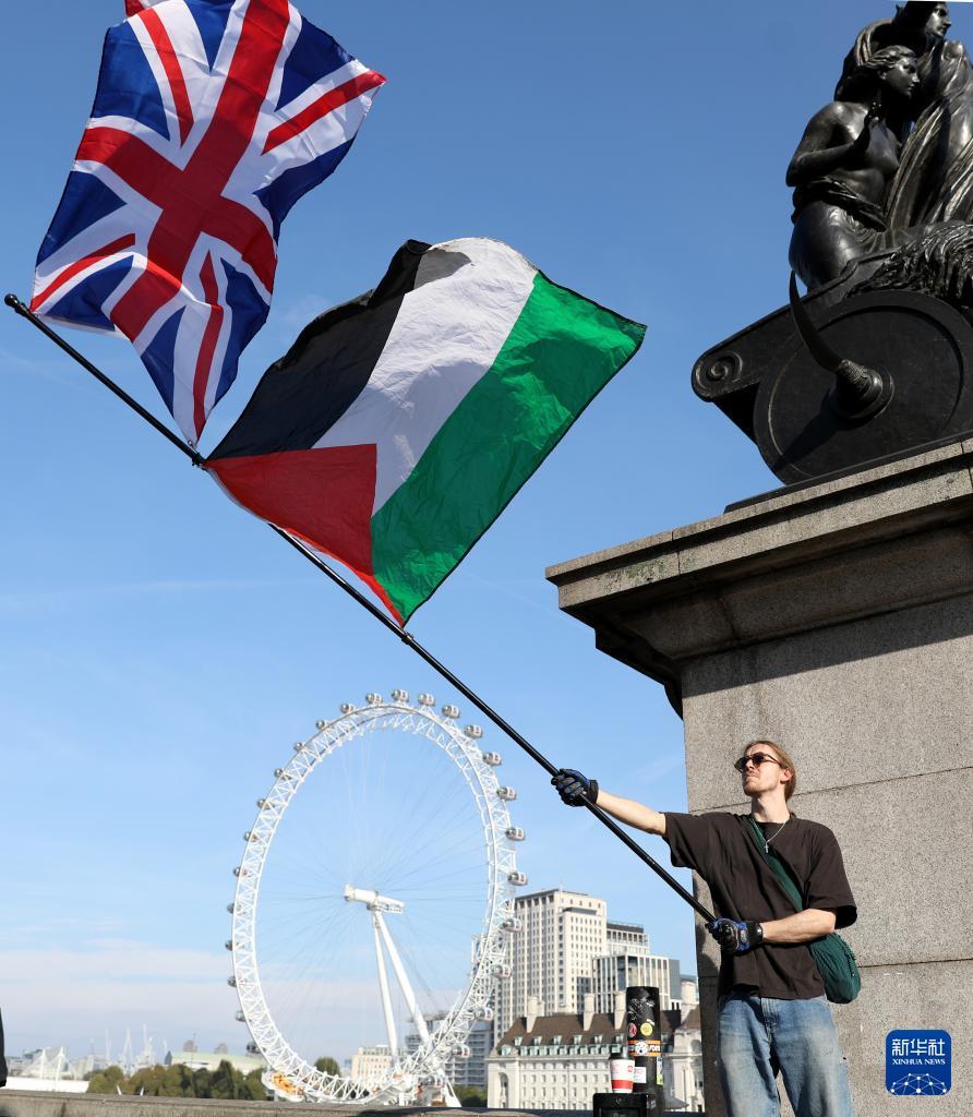 10月11日,一名男子在英国伦敦眼附近参加游行活动。 当日,英国民众在伦敦举行游行活动声援巴勒斯坦,呼吁加沙实现持久和平。 新华社记者 李颖 摄
