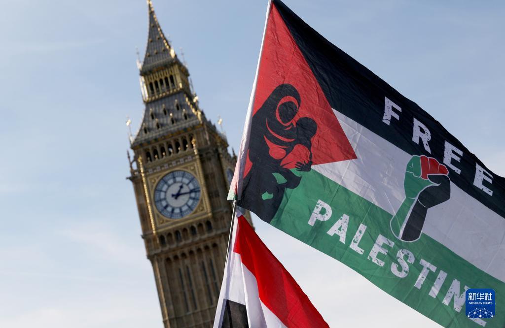 10月11日,在英国伦敦,游行队伍经过大本钟。 当日,英国民众在伦敦举行游行活动声援巴勒斯坦,呼吁加沙实现持久和平。 新华社记者 李颖 摄