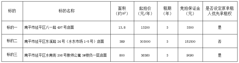 受委托,定于2025年10月24日上午9:00,通过延平区阳光平台(http://ypygpt.zgpm.com/)举行公开网络竞拍: 一、竞拍标的:南平市延平区东溪路、八一路、水南街店面三年期租赁权,具体标的详情如下: 南平市延平区东溪路、八一路、水南街店面三年期租赁权一览表