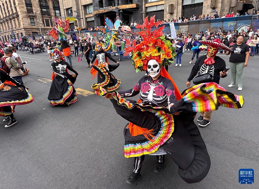 10月18日,在墨西哥首都墨西哥城,身着亡灵节服饰的舞者参加魔幻动物大游行(手机照片)。 当日,为迎接即将到来的亡灵节,墨西哥城举办魔幻动物“Alebrijes”大游行。“Alebrijes”是一种墨西哥传统手工艺品,用鲜艳的颜色和丰富的图案装饰,展现充满想象力的奇幻动物形象。 新华社记者 武巍 摄