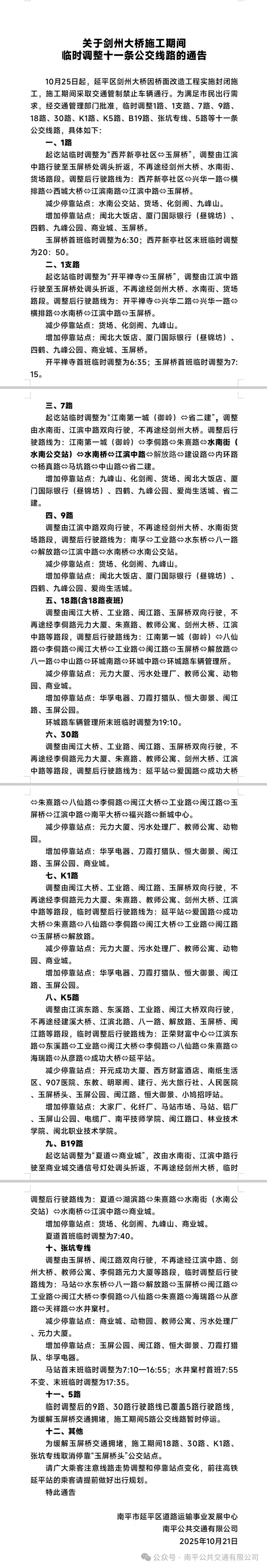 关于剑州大桥施工期间临时调整十一条公交线路的通告