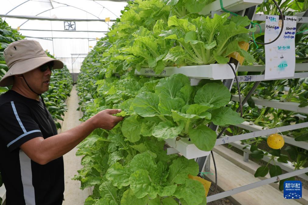 11月3日,在文莱斯里巴加湾市郊一处农业科技产业园,来自中国宁夏回族自治区固原市的农业技术专家李继华查看用水培技术种植的蔬菜的生长情况。 近年来,文莱政府不断深化与中国在农业领域的交流合作。在文莱斯里巴加湾市郊一处农业科技产业园,通过中国沙培技术成功种植的网纹蜜瓜近日喜获丰收,在当地市场很受欢迎。此外,该产业园还利用中国先进农业技术及农业设备开展草莓、茄子、辣椒等果蔬的培育种植,在为文莱市场提供高品质果蔬产品的同时,进一步推动文莱农业现代化发展。 新华社记者 李萌 摄