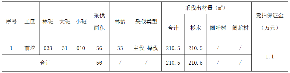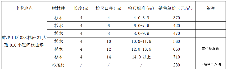 受委托,定于2025年11月14日上午9:00,通过延平区阳光平台(http://ypygpt.zgpm.com/)举行公开网络竞价: 一、竞拍标的:南平市延平区王台镇高埠村前坨工区间伐木材生产销售(二次竞拍),标的详情见表1:《南平市延平区王台镇高埠村前坨工区间伐山场设计出材量表》,表2:《间伐材各树材种各径级起拍价底价表》。 表1:《南平市延平区王台镇高埠村前坨工区间伐山场设计出材量表》