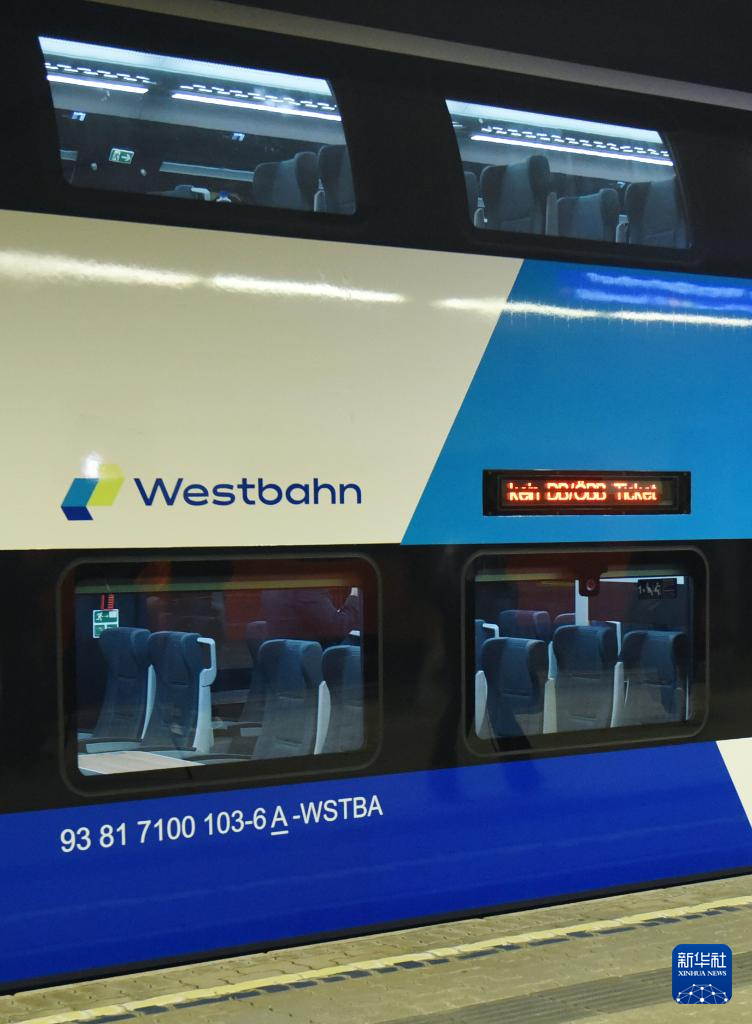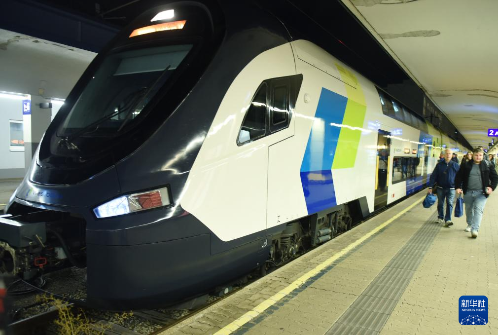 这是11月3日在奥地利维也纳拍摄的由中国中车株洲电力机车有限公司生产的双层列车。 由中国企业制造的双层列车日前在奥地利首都维也纳亮相,将用于维也纳与萨尔茨堡两座城市间客运铁路运营。这是中国制造双层列车首次正式投入奥地利客运铁路系统。 新华社记者 贺灿铃 摄