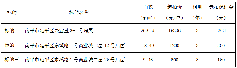 受委托,定于2025年11月19日上午9:00,通过延平区阳光平台(http://ypygpt.zgpm.com/)举行公开网络竞拍: 一、竞拍标的:南平市延平区兴业里、东溪路店面(房屋)三年期租赁权,具体标的详情如下: 南平市延平区兴业里、东溪路店面(房屋)三年期租赁权一览表