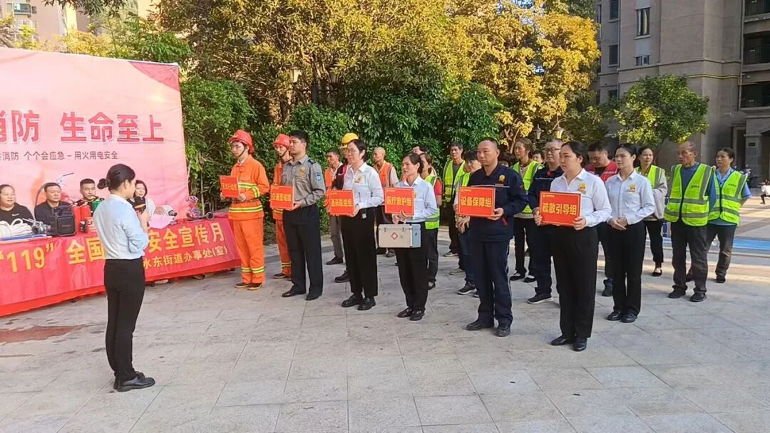 11月7日,在第34个全国消防日即将到来之际,水东街道恒大御景小区内警铃骤响,一场以“全民消防 生命至上”为主题的消防应急演练紧张有序开展。此次活动按照区委、区政府工作部署,由水东街道办事处牵头,联合南平安然燃气有限公司、黄丛岭社区、金碧物业四方联动,通过模拟真实火情与实操教学,让居民沉浸式掌握逃生技能与灭火本领,为社区安全筑牢防护网。