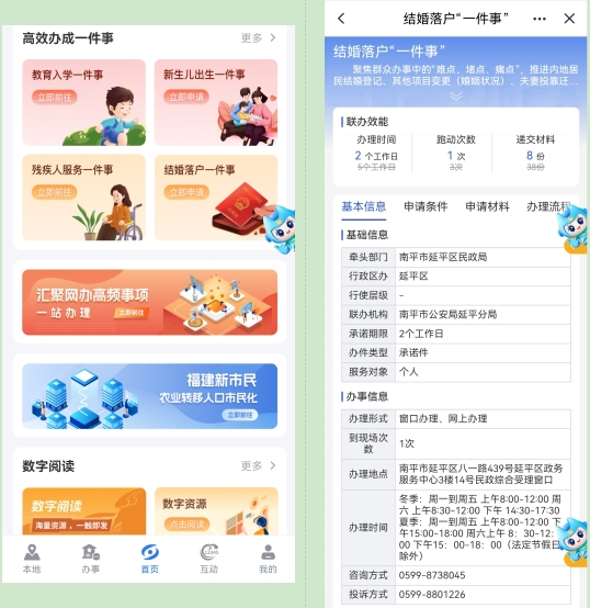 “原本以为领证、迁户口要跑好几个部门,没想到在区政务服务中心一个窗口就能全搞定,20分钟拿到结婚证和新户口本,太省心了!”近日,刚办完手续的新人张先生和李女士,拿着崭新的证件对“结婚落户一件事”集成服务连连称赞。 为破解群众办事“多头跑、材料繁、耗时长”的痛点,延平区以“高效办成一件事”改革为牵引,将涉及民政、公安等部门的结婚登记、其他项目变更(婚姻状况)、夫妻投靠迁移审批3项关联业务整合为“一件事”,提供“一表申请、一套材料、一窗受理、一网办理”服务。通过数据共享、信息互认、重构流程,改革前群众需跨部门跑多趟、提交38份材料;如今,材料申请精简78%,办理承诺期限精简60%,大幅减少办事跑腿次数。结合婚姻登记“全国通办”最新政策,新人仅凭身份证及相关签字声明即可申请,无需额外提供户口本,减轻群众办事负担。 为满足不同群体需求,延平区还打造线上线下双轨服务体系。线上通过“闽政通”APP、省网上办事大厅“高效办成一件事”专区,可实现信息填报、材料上传、预约办理、进度查询全流程“掌上办”,真正实现办事“零跑腿”;线下在三楼政务大厅设有综合受理窗口,配备专业“帮办代办”人员,提供材料复印、流程指引、现场拍照等暖心服务,优化群众登记办事体验。