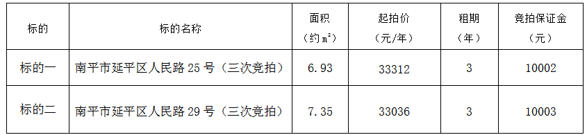 二、竞拍保证金及平台报名截止时间 竞拍保证金截止时间:具体竞拍保证金详见以上表格,即日起至2025年11月24日下午5时前; 平台报名截止时间:即日起至标的开拍前半小时。 报名时凭竞拍保证金缴存凭据确认竞租人资格。具体办理报名、看样、缴纳竞拍保证金等相关手续,请有意竞租人与我中心联系。 竞拍保证金汇入以下指定账户: 户名:南平市延平区公共资源交易中心; 账号:9558831406000015950; 开户行:中国工商银行股份有限公司南平延平支行。 三、本次竞拍标的物优先承租权:无原承租人。 四、展示地点:标的物所在地;展示时间:2025年11月17日起。 五、联系地址及详情咨询电话: 中心地址:南平市延平区公共资源交易中心(南平市延平区八一路439号南平市延平区政务服务中心4楼)。 中心联系人:0599-8801022小张。 看房联系人:0599-8849421郑青。 六、有关竞拍的其他事项及规定详见《竞拍规则》。 微信公众号:延平区政务服务中心。 发布竞拍公告及规则的媒介:南平市公共资源交易中心延平区分中心(https://ggzy.np.gov.cn/yp/)、延平区阳光平台(http://ypygpt.zgpm.com/)、中国拍卖行业协会网站、延平区人民政府网(http://www.ypzf.gov.cn/)、延平新闻网。 南平市延平区公共资源交易中心 中拍平台网络科技股份有限公司 2025年11月17日 |