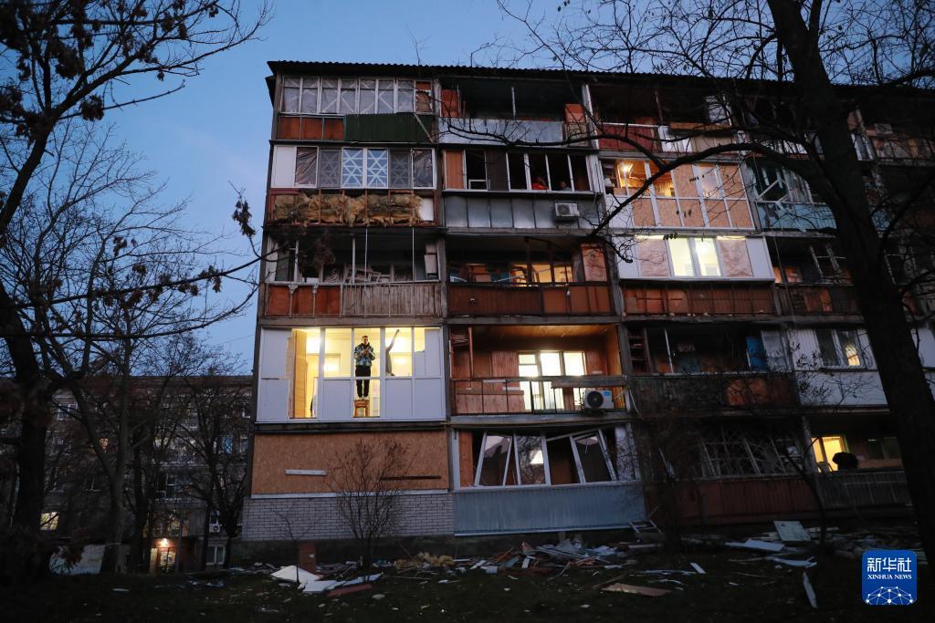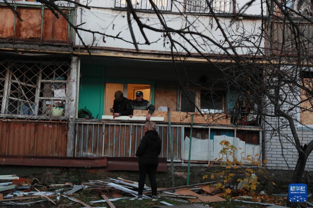 11月14日,在乌克兰首都基辅市第聂伯区,当地居民对遭受空袭损毁的房屋进行修缮加固。 当天凌晨,基辅遭到俄军大规模空袭。 新华社记者 李东旭 摄