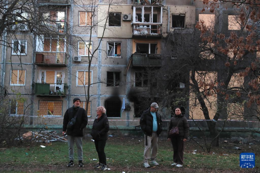 11月14日,在乌克兰首都基辅市第聂伯区,当地居民站在遭受空袭损毁的房屋前。 当天凌晨,基辅遭到俄军大规模空袭。 新华社记者 李东旭 摄