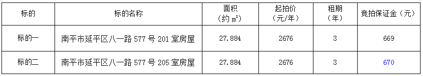 二、竞拍保证金及平台报名截止时间: 竞拍保证金截止时间:具体竞拍保证金详见以上表格,即日起至2025年12月2日下午5:00前; 平台报名截止时间:即日起至标的开拍前半小时。 报名时凭竞拍保证金缴存凭据确认竞租人资格。具体办理报名、看样、缴纳竞拍保证金等相关手续,请有意竞租人与我中心联系。 竞拍保证金汇入以下指定账户: 户名:南平市延平区公共资源交易中心; 账号:9558831406000015950; 开户行:中国工商银行股份有限公司南平延平支行。 三、本次竞拍标的物优先承租权:无原承租人。 四、展示地点:标的物所在地;展示时间:2025年11月25日起。 五、联系地址及详情咨询电话: 中心地址:南平市延平区公共资源交易中心(南平市延平区八一路439号南平市延平区政务服务中心4楼)。 中心联系人:0599-8801022小张。 看房联系人:18950630676赵女士。 六、有关竞拍的其他事项及规定详见《竞拍规则》。 微信公众号:延平区政务服务中心。 发布竞拍公告及规则的媒介:南平市公共资源交易中心延平区分中心(https://ggzy.np.gov.cn:9095/yp/)、延平区阳光平台(http://ypygpt.zgpm.com/)、中国拍卖行业协会网站、延平区人民政府网(http://www.ypzf.gov.cn/)、延平新闻网。 南平市延平区公共资源交易中心 中拍平台网络科技股份有限公司 2025年11月25日 |