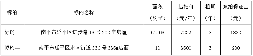 受委托,定于2025年12月16日上午9:00,通过延平区阳光平台(http://ypygpt.zgpm.com/)举行公开网络竞拍: 一、竞拍标的:南平市延平区进步路、水南街道店面(房屋)三年期租赁权,具体标的详情如下: 南平市延平区进步路、水南街道店面(房屋)三年期租赁权一览表