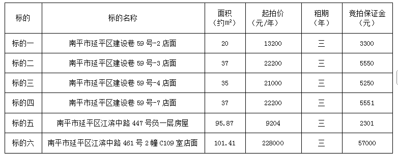 受委托,定于2025年12月17日上午9:00,通过延平区阳光平台(http://ypygpt.zgpm.com/)举行公开网络竞拍: 一、竞拍标的:南平市延平区建设巷59号、江滨中路店面三年期租赁权,具体标的详情如下: 南平市延平区建设巷59号、江滨中路店面三年期租赁权一览表