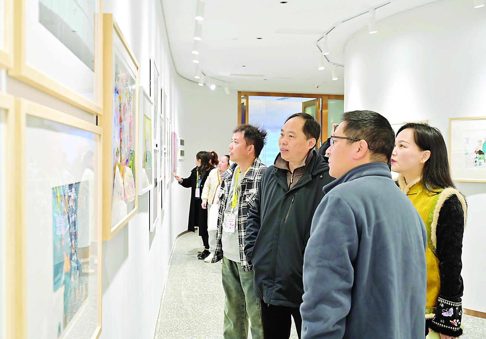 近日,由中国美术家协会、福建省文学艺术界联合会、南平市人民政府联合主办的“中国美协艺委会届展系列:2025少儿美术作品展览”在南平大剧院与浦城美术馆/范迪安美术馆同步开展。 本次展览共征集近1.25万件作品,经专家评审甄选出875件优秀作品参展。作品涵盖国画、油画、水彩画等多种形式,展现了新时代少儿的创造力与精神风貌,展览将持续至2026年3月8日。图为市民在观展。(罗光耀 摄) |