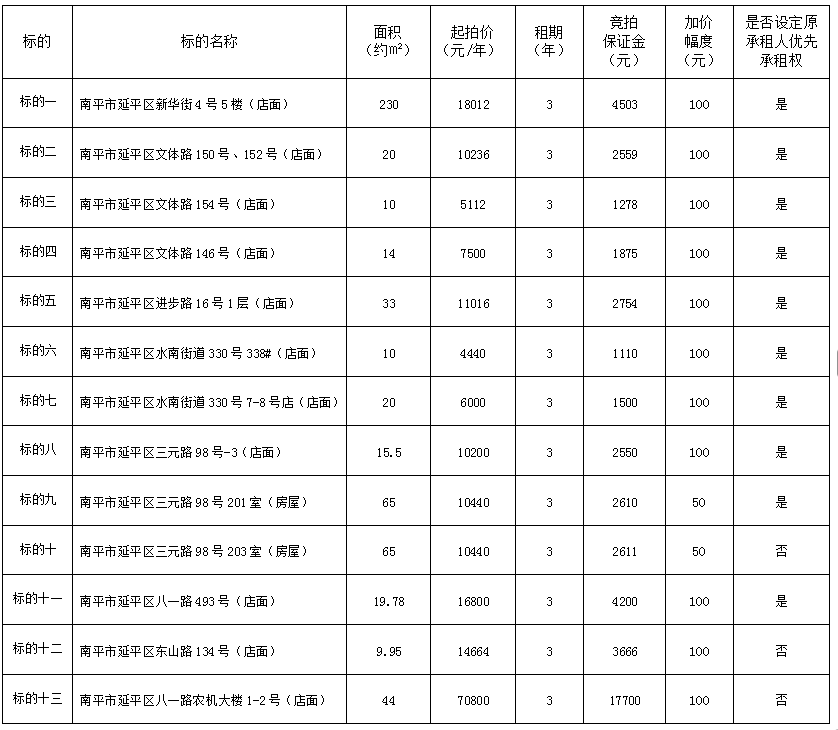 受委托,定于2025年12月19日上午9:00,通过延平区阳光平台(http://ypygpt.zgpm.com/)举行公开网络竞拍: 一、竞拍标的:南平市延平区新华街、八一路、水南街、东山路、三元路、进步路、文体路店面(房屋)三年期租赁权,具体标的详情如下: 南平市延平区新华街、八一路、水南街、东山路、三元路、进步路、文体路店面(房屋)三年期租赁权一览表
