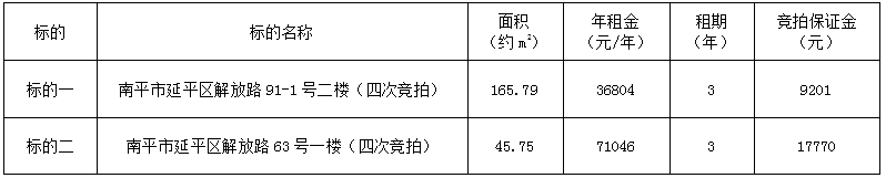 受委托,定于2025年12月23日上午9:00,通过延平区阳光平台(http://ypygpt.zgpm.com/)举行公开网络竞拍: 一、竞拍标的:南平市延平区解放路91-1号二楼、解放路63号一楼店面三年期租赁权(四次竞拍),具体标的详情如下: 南平市延平区解放路91-1号二楼、解放路63号一楼店面三年期租赁权(四次竞拍)一览表