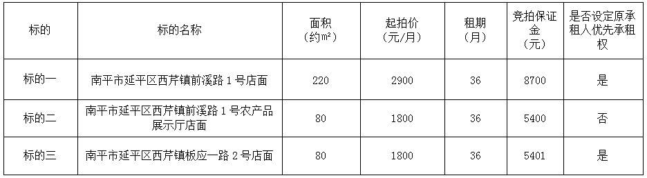 受委托,定于2025年12月23日上午9:00,通过延平区阳光平台(http://ypygpt.zgpm.com/)举行公开网络竞拍: 一、竞拍标的:南平市延平区西芹镇前溪路1号、板应一路2号店面36个月租赁权,具体标的详情如下: 南平市延平区西芹镇前溪路1号、板应一路2号店面36个月租赁权一览表