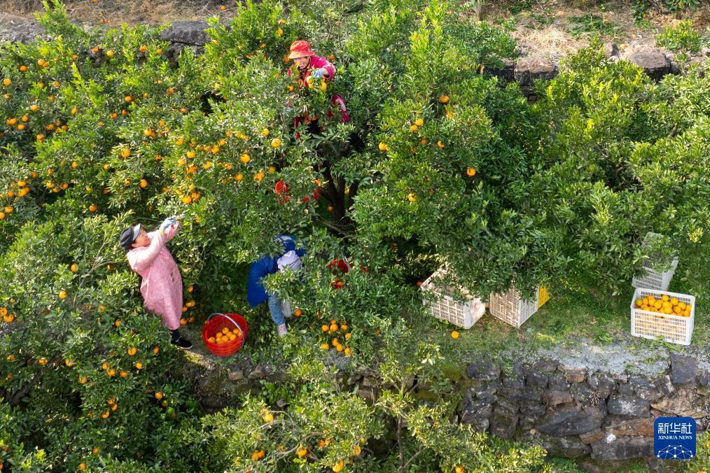 12月11日,在湖北省宜昌市长阳土家族自治县渔峡口镇岩松坪村,村民在采摘清江椪柑(无人机照片)。 近日,湖北省宜昌市长阳土家族自治县渔峡口镇的清江椪柑进入采销旺季。2024年,全县清江椪柑种植规模达7万亩,年产值约5亿元。产品销往全国29个省市,并出口到马来西亚、加拿大、西亚等国家和地区。清江椪柑已成为当地乡村振兴战略的支柱产业。 新华社记者 杜子璇 摄