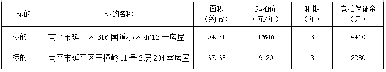 受委托,定于2025年12月31日上午9:00,通过延平区阳光平台(http://ypygpt.zgpm.com/)举行公开网络竞拍: 一、竞拍标的:南平市延平区316国道小区、玉樟岭房屋三年期租赁权,具体标的详情如下: 南平市延平区316国道小区、玉樟岭房屋三年期租赁权