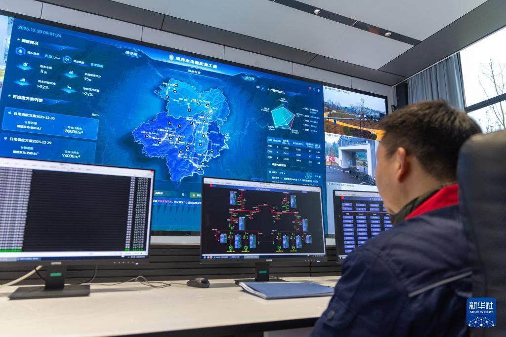 12月30日,工作人员在渝西水资源配置工程金刚沱泵站调度中心监看设备运转情况。 记者从重庆市水利局获悉,渝西水资源配置工程12月30日实现全线通水。该工程总投资143.45亿元,年供水量超10亿立方米,将惠及约1000万人口,是重庆历史上投资规模最大、覆盖范围最广、受益人口最多的民生水利工程。 渝西水资源配置工程主要由东干线、嘉陵江干线和西干线组成。工程全线通水后,年供生活用水量4.67亿立方米、工业用水量5.45亿立方米,将有效改善渝西地区生产、生活用水条件,助推成渝地区双城经济圈高质量发展。 新华社记者 黄伟 摄