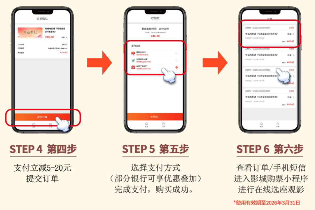 STEP1 第一步:选择需购买的影城兑换券 STEP2 第二步:查看详情,点击“立即购买” STEP3 第三步:系统随机发放(5-20元)“有福电影优惠券”立即使用 STEP4 第四步:支付立减5-20元,提交订单 STEP5 第五步:选择支付方式(部分银行可享优惠叠加)完成支付,购买成功。 STEP6 第六步:查看订单/手机短信,进入影城购票小程序,进行在线选座观影 活动须知 1、用户购买任意影城电影票兑换券均可享受“有福电影优惠券”随机立减金额(5-20元)。 2、每个手机号可享受2笔随机立减订单,每笔订单可购买1张。 3、提交订单,部分银行可享支付叠加优惠,可选择相应银行进行优惠支付。 4、支付成功,影城兑换券将以短信形式发送至手机号,也可在“订单”中查询,用户可凭券码至相应影城购票小程序兑换电影票。 5、可在票券有效期内,兑换任一时间2D、3D影票,不可兑换特殊场(如明星见面会、首映礼等),春节期间兑换电影票,部分影城需补差,可至订单详情页查询。 6、所有电影兑换券一经购买,不退不换,过期自动失效(有效期至2026年3月31日)。 7、所有票券成功兑换电影票后,不可更换观影场次、不可退票、不可改签。 *温馨提示:如您在参与活动时有任何问题,均可联系400-133-5679(早09:00-晚21:00)。 此次活动,福建省电影局联合福建金融系统、全省影城共同投入800万元开展电影消费活动,其中发放5-20元“有福电影优惠券”15万张,为福建省电影观众送上一份超值的新年大礼包。