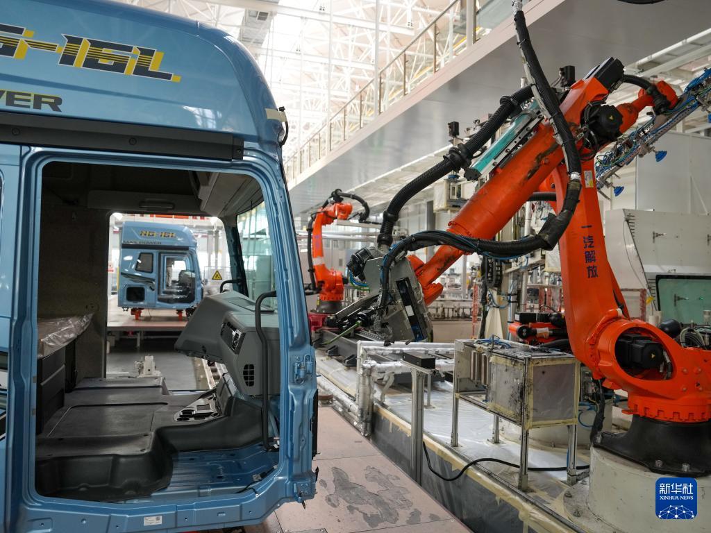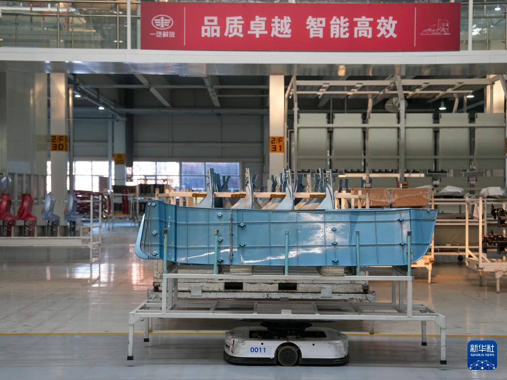 1月4日,在一汽解放J7整车智能工厂,机器人搬运车辆行进在生产线上。 新年伊始,坐落于吉林省长春市的一汽解放J7整车智能工厂内,工人们开足马力抓紧生产,力争实现新年“开门红”。2025年,一汽解放全年销售整车突破28万辆。 新华社记者 张楠 摄
