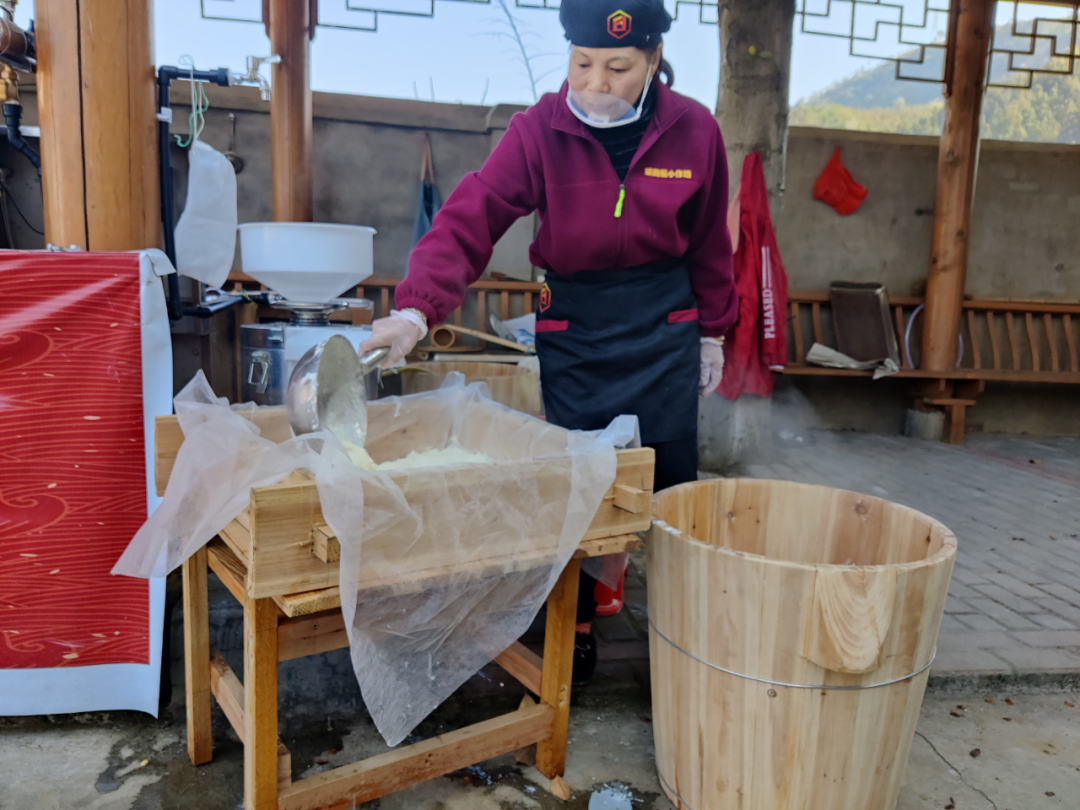 清晨,南山镇明前街村村级农产品小作坊里已是热气腾腾、豆香四溢。工人们熟练地磨豆、煮浆、压制成型,一块块洁白如玉、嫩滑清香的豆腐新鲜出炉,随即被仔细分装,准备送往客户手中。