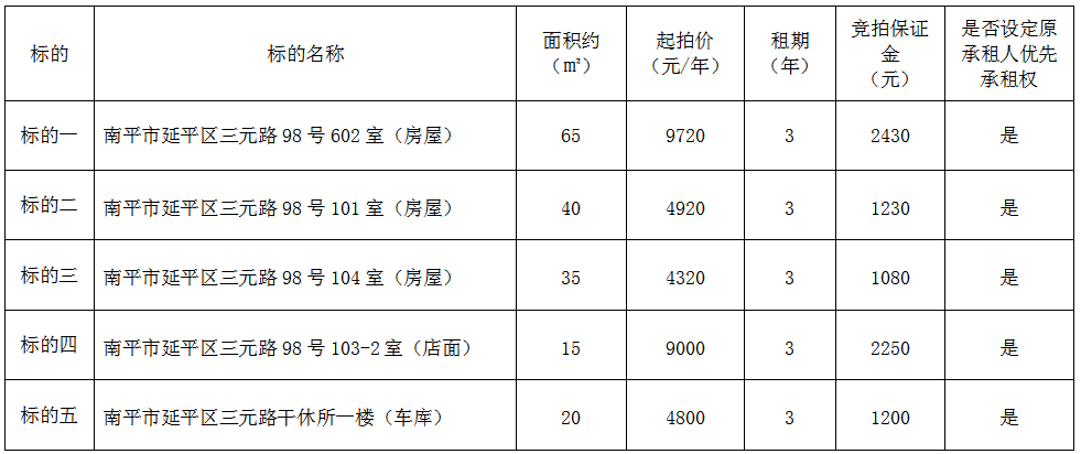 受委托,定于2026年1月27日上午9:00,通过延平区阳光平台(http://ypygpt.zgpm.com/)举行公开网络竞拍: 一、竞拍标的:南平市延平区三元路房屋(店面、车库)三年期租赁权,具体标的详情如下: 南平市延平区三元路房屋(店面、车库)三年期租赁权一览表
