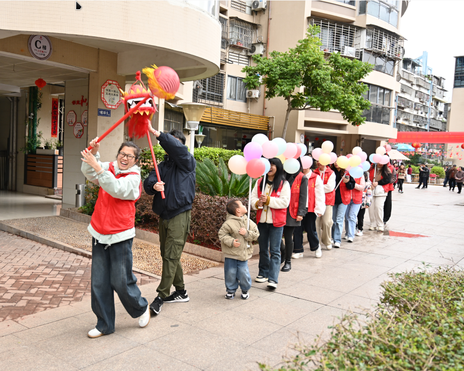 “马跃新春·舞龙助势”将活动氛围推向高潮,小朋友们身着喜庆服饰,手持气球制作的创意龙身巡游小区,用童趣的方式传递新春祝福,延续了舞龙迎春的传统习俗。
