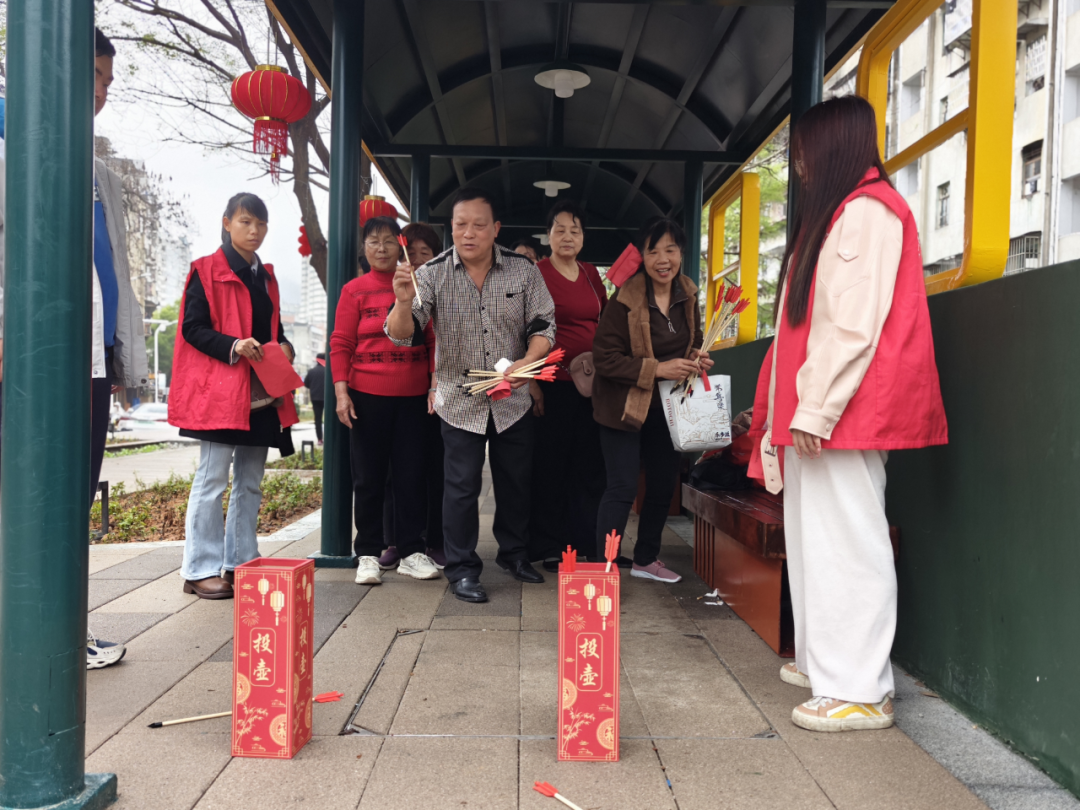 趣味游园区人气爆棚,四大传统项目让居民们乐在其中。猜灯谜摊位前,大家凝神思索、踊跃抢答,欢声笑语不断;投壶区内,选手们屏气凝神、精准投掷,喝彩声此起彼伏;拾弹珠游戏考验速度与技巧,居民们手持筷子专注夹取,尽显身手;套圈圈摊位前,大家瞄准目标、果断出手,现场洋溢着欢乐祥和的节日氛围。
