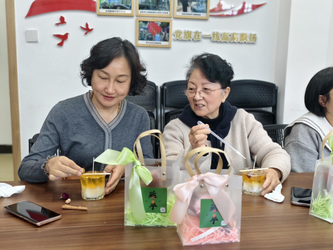 活动现场,花香四溢,笑语盈盈。专业指导老师首先为大家详细讲解了香薰的制作步骤、各类精油的功效以及香薰蜡烛的制作步骤。在老师的示范和指导下,大家纷纷化身“能工巧匠”,精心挑选干花,构思造型,将一份份对美好生活的理解和感悟融入到作品之中。融化豆蜡、调制颜色、添加精油、冷却定型、点缀花饰……每一个步骤都做得专注而认真。经过一个多小时的精心制作,一份份独一无二、充满创意和芳香的香薰蜡烛逐一诞生。看着自己亲手制作的精美艺术品,大家的脸上洋溢着幸福、自豪的笑容,纷纷捧着自己的作品合影留念,记录下这美好的瞬间。 活动间隙,志愿者们开展了党的创新理论“百人千场进万站”文明实践示范宣讲活动。宣讲员结合社区近年来的发展变化和居民生活的切实改善,用通俗易懂的语言、生动鲜活的事例,深入浅出地解读了党的创新理论中关于共同富裕、家庭家教家风建设、保障妇女儿童合法权益等重要论述和精神实质。宣讲既有理论高度,又紧密联系基层实际,将深邃的理论转化为妇女姐妹们听得懂、能领会的“家常话”,引发了在场听众的强烈共鸣。