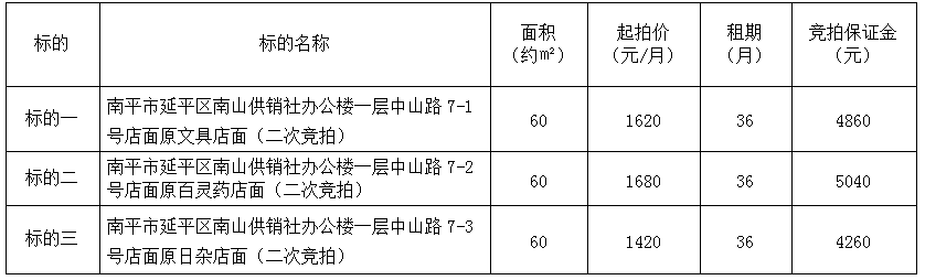 受委托,定于2026年3月25日上午9:00,通过延平区阳光平台(http://ypygpt.zgpm.com/)举行公开网络竞拍: 一、竞拍标的:南平市延平区南山供销社办公楼一层中山路店面36个月租赁权(二次竞拍),具体标的详情如下: 南平市延平区南山供销社办公楼一层中山路店面36个月租赁权(二次竞拍)一览表