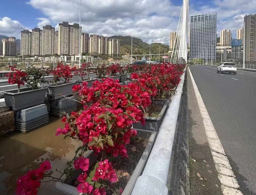 如今,一幅幅清新靓丽的门户画卷徐徐展开。在建溪大桥的桥面,三角梅迎着春风次第绽放,近百株红花缀满桥身,与江水相映成趣,满目明艳动人。