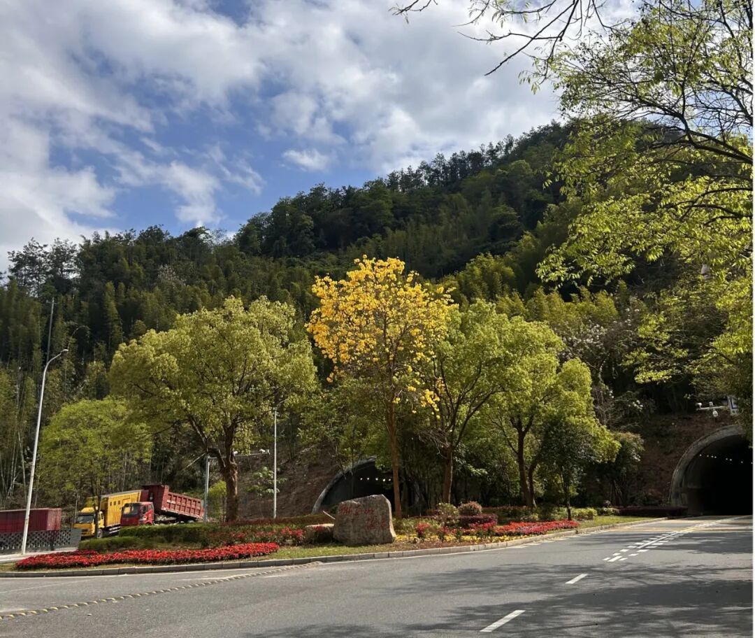 狮子山隧道往湖尾村方向的道路,经过花境修剪、清表与地形整理,移除老化苗木后,新植上千株三色超级凤仙,层次更丰富、色彩更鲜活。