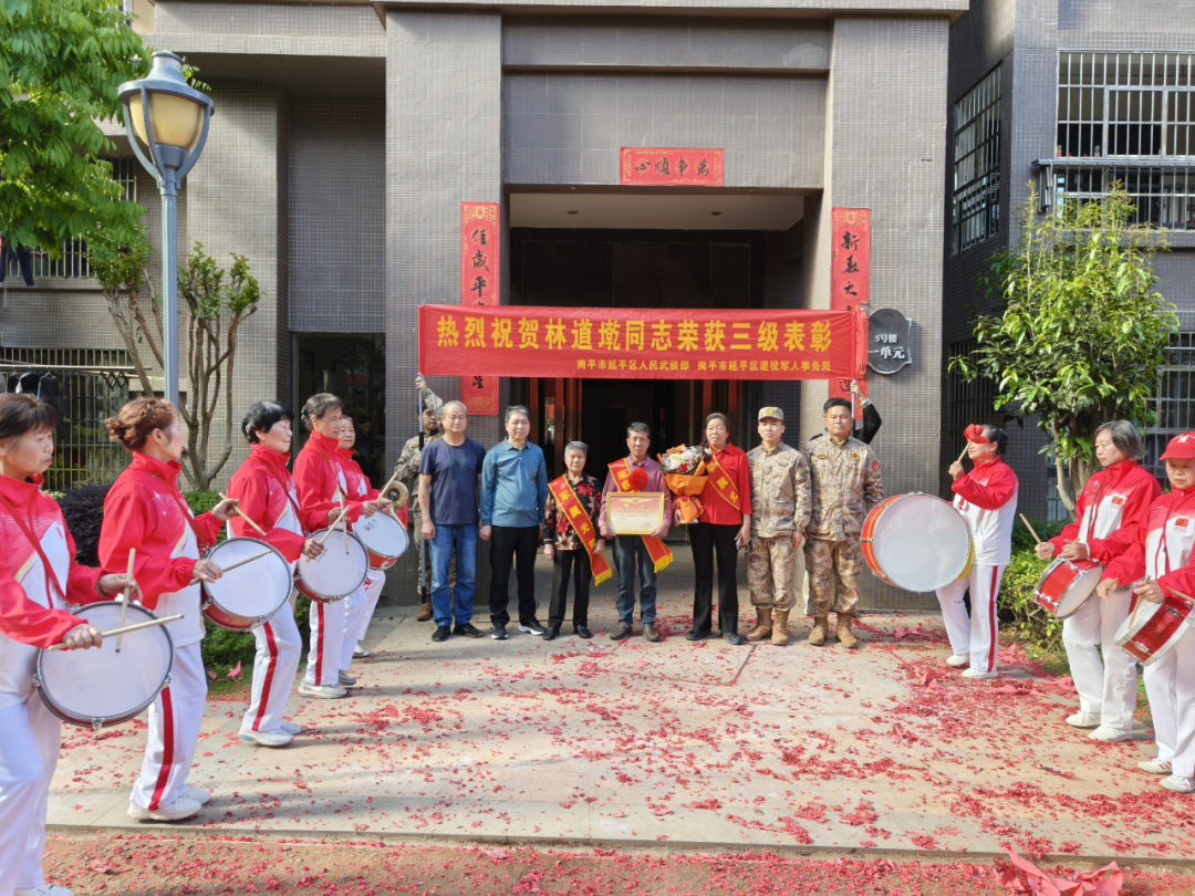 送喜报现场,锣鼓声声、喜气洋洋,鲜红绶带与烫金喜报交相辉映,引得群众纷纷驻足围观、齐声喝彩,共同见证这份荣耀时刻。 赤门乡人武部负责同志郑重宣读表彰通报,详细介绍了林道墘同志在部队的先进事迹:林道墘同志在部队服役期间始终恪尽职守、奋勇争先,2021年曾荣立三等功,展现出过硬的军事素养和责任担当;2025年,他充分发挥自身过硬的装备保障能力,实绩更加突出、表现尤为优异,多次随队参加重大演训活动,始终以精益求精的态度、扎实过硬的本领奋战在装备保障一线,圆满完成各项任务,以实际行动践行新时代军人的使命担当,为部队战斗力建设作出积极贡献,此次荣获装备工作先进个人三级表彰,是对他多年来辛勤付出的又一高度肯定。
