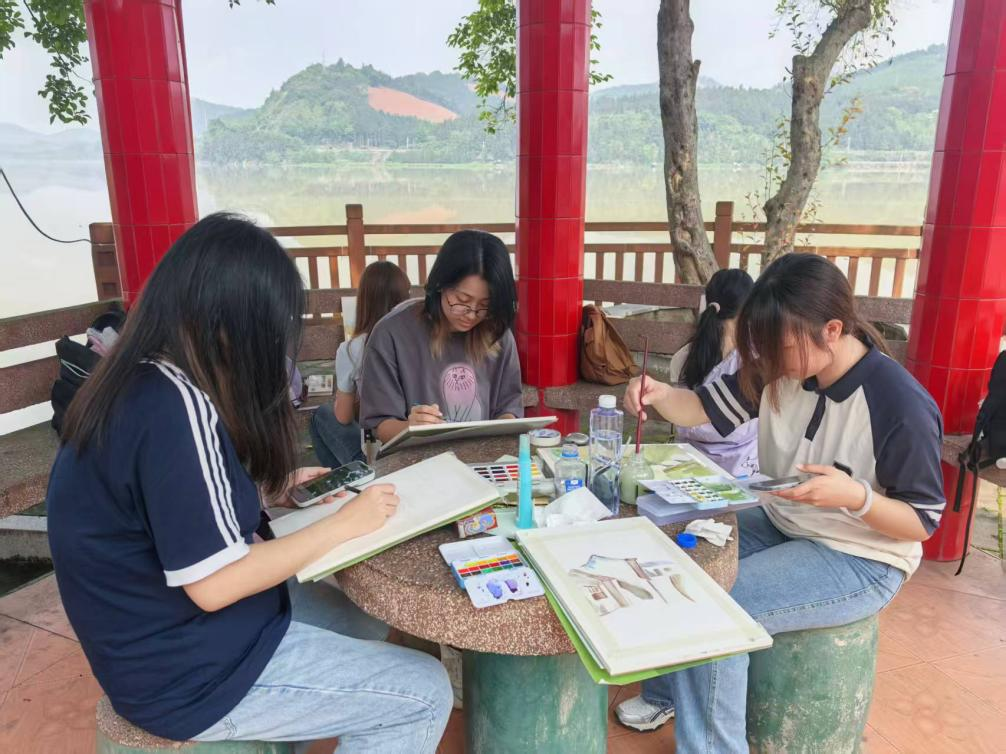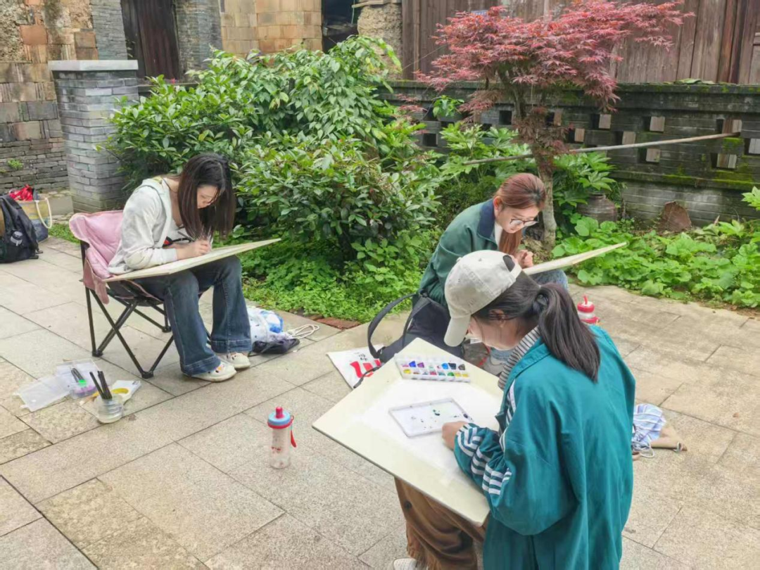 在老师的带领下,学生们肩背画板、手持画笔,穿行于江汜古村的青石小巷、斑驳老宅、河畔凉亭之间,每一处角落都成为天然的“画室”。学生们沉浸在历史肌理与自然生态的交融中,用心捕捉光影变幻,在实景中感受美、发现美、创造美,审美素养与专业实践能力悄然提升。