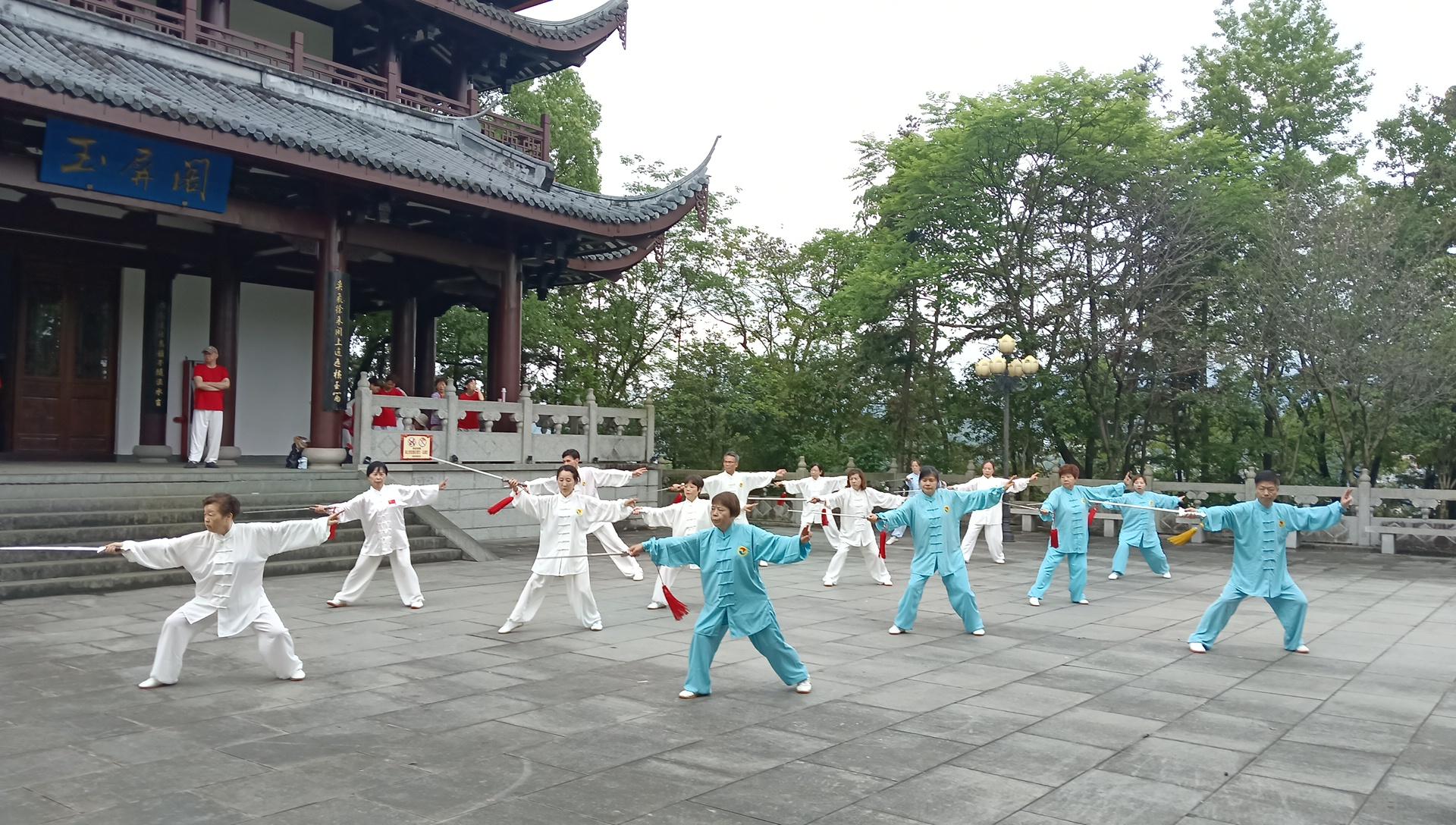 4月18日上午8点,雨后天晴、风和日丽、暖意融融,阳光太极队成立六周年暨首届年会展演在玉屏阁精彩上演。 从最初6名爱好者相约练拳,到如今拥有110名队员,这支扎根民间的太极队伍历经六年耕耘,不断发展壮大,已成为当地传承太极文化、推广全民健身的亮眼力量,深得市民好评与认可。 展演现场气氛热烈、秩序井然,队员们身着统一服装,精神饱满、列队登场。伴着悠扬雅致的太极乐曲,大家身姿稳健、招式舒展,将太极刚柔相济、动静结合的韵味展现得淋漓尽致。 集体展演中,陈式太极13式气势连贯、整齐划一,24式太极剑行云流水、精准规范,观音拳轻柔端庄、气韵十足,队员们默契协作,尽显团结向上的团队风采。